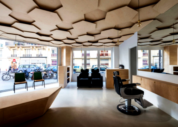 Потрясающий подвесной потолок, который состоит из множества шестиугольных панелей, стилизованных под дерево — прекрасное решение для просторной гостиной, конференц-зала или фойе.
