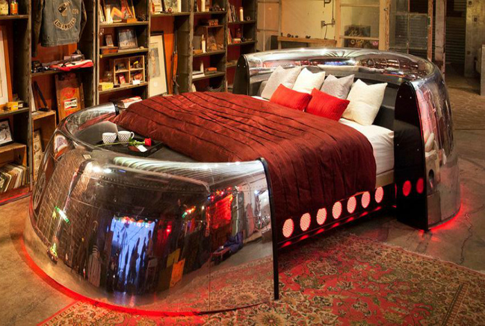 Исключительный дизайн кровати, собранной из запчастей самолета Boeing 747, также именуемого «Джамбо Джет», станет потрясающим дополнением современной спальни и, наверняка, придется по вкусу истинным любителям самолетов и авиации.