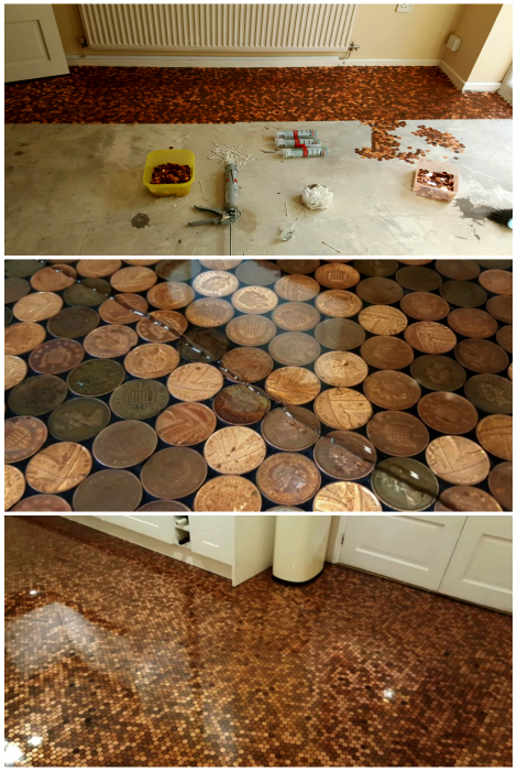 Не пол, а просто остров сокровищ! А все потому, что он выложен огромным количеством монеток. Надежно прикрепить монеты к полу можно с помощью силикона, после чего все зазоры нужно затереть специальным раствором. Заключительный этап — покрытие пола эпоксидной смолой.