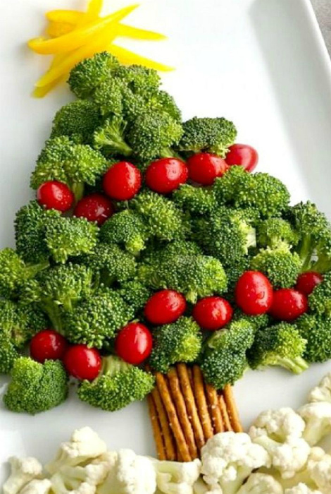 Любители овощей наверняка оценят эту идею подачи цветной капусты, помидоров и перчика, выложенных в виде новогодней елки.